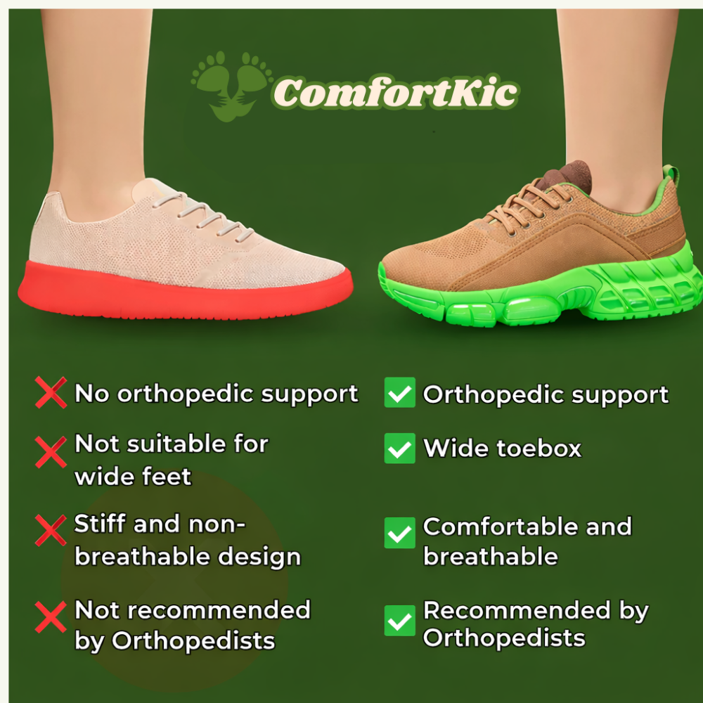 Tired of shoes that feel rigid, lack cushioning, and leave your feet sore by midday? ComfortKic™ changes that with ultra-comfortable orthopedic design, a wide toe box, and supportive cushioning that keeps you moving in comfort and style. No more foot pain — just all-day relief you can feel.